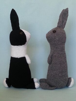 A rabbit sitting up on its haunches. It is knit flat and can be made in a single body colour or in a Dutch rabbit two-colour pattern.