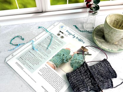 Raggedy Ruffles are fun and funky hand warmers with soft ruffles that won’t need blocking every time they are washed. Whether knitted in Worsted or DK weight yarn, they are designed to use all those fabulous little leftovers; pick four or five colors that play well together. Hand-dyed and printed color yarns add to the raggedy ruffled look that will be fun to wear. Your choice of colors can give you a look from girly to steampunk. You will have two wrist ruffles just below the thumb.