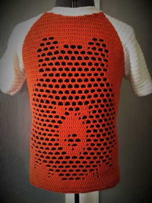 Skill Level: Intermediate US Crochet Terms This crochet pattern is for a raglan t-shirt, with a large bear picture. The pattern can be used to make a mesh, filled or plain version of the t-shirt. You will need to know how to change colours if you are making a filled version, as this is not covered in the instructions. The pattern was designed using DK acrylic yarn and is made in four pieces and then sewn together. The instructions include lots of detail to ensure complex shaping is made easy. Pictures are used to highlight placement of stitches. There is a lot of stretch in the finished item, so the sizing is only approximate. I have listed this pattern as "intermediate" because of shaping and pattern techniques. It also requires reading a pattern with multiple sizes.