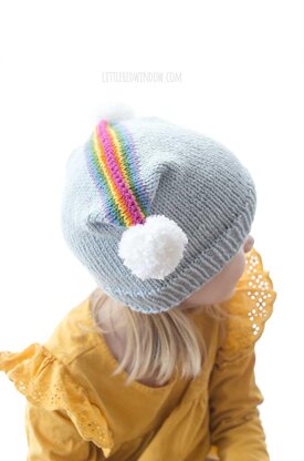 The Rainbow Double Pom Pom Hat kntiting pattern is super easy to knit in any of four sizes for your baby or toddler. This hat is knit in the round but there is no decrease section which means you do not need to decrease with double pointed knitting needles! The hat is finished with an easy three needle bind off (instructions for this technique included) and two fluffy white cloud pom poms on top.