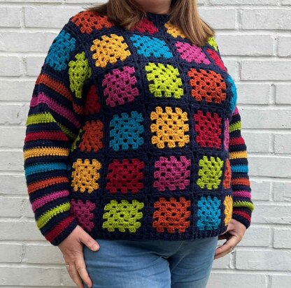 You can get the crochet pattern to make your own Rainbow granny squares sweater.