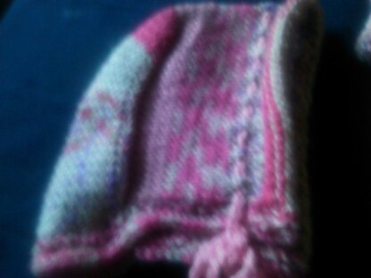 This bonnet is part of a set I designed for a friend's grand baby. It matches the raindrops and roses baby socks, also here on ravelry. The bonnet is very simple, mostly stockinette with a few rows of eyelets. The bonnet is shaped with short rows but don't worry, it is easy! You will need also an E hook for making the tie or just use some pretty ribbon!