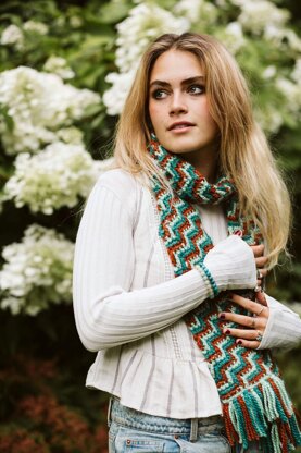 Keep cosy from season to season with a statement scarf in luxe silk blend yarn. This clever geometric accessory showcases the Apache Tears stitch pattern, with bold zigzag stripes formed by double crochet and front post double treble stitches.