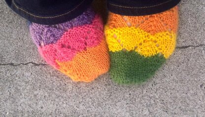 These colourful, lacy, textured, cheerful socks are worked from the toe up with a gusset and slipstitched flap heel. Using up to 7 colours of a light worsted-weight yarn, they knit up amazingly quickly and are super cosy under boots or to wear around the house. The lace pattern has texture and a slight ripple effect, and is simple enough for less experienced knitters.