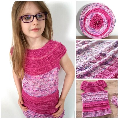 This adorable tunic will be an ideal piece for the warmer season. The simple, yet fun, design coupled with the light and luxurious yarn will easily turn this into a favorite for outtings or just lounging at home. First worn as a dress, then as a long tunic and last as a sweater, this top will grow with your child!