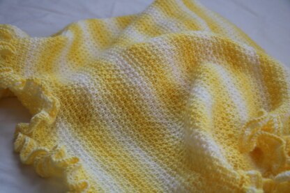 Hand-knitted in Woven st pattern which is easy. Ruffle is worked as one piece with a blanket .Pick up stitches to make ruffle on the sides of a blanket. You can sew ruffle edges together or leave them loose.