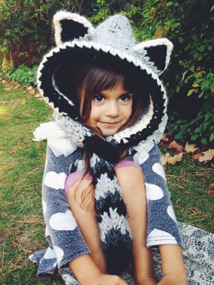 Raymond the Raccoon features a three dimensional stuffed tail on one end of the scarf while the shorter end is a paw that has a loop on the back to tuck the tail through in order to keep the scarf closed.