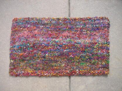 Great beginner project. Just uses knit and purl stitches but with the Recycled Silk, it looks like a very fancy project. Framed with a border of seed stitch(so it lays flat), the inside area of the rug is in stockinette.
