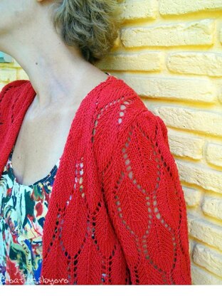 Finished size: Size S/M length 35cm/14" Width in back : 43cm/17.2" Sleeves: length 32cm/12.8:, width 28cm/11.2" Yarn: cotton yarn weight light 50gr (1.75 oz)/125 m (130 yds): 4-4.5 skeins (585 yds), Millefili fine by Filatura di Crosa, color 55 red. Needle: US 7 (4,5mm) - Adjust needle size to obtain correct gauge Notions: tapestry needle,. Gauge: 22 st x 29 rows in lace stitch = 10x10cm, or 4”x4” Level: intermediate