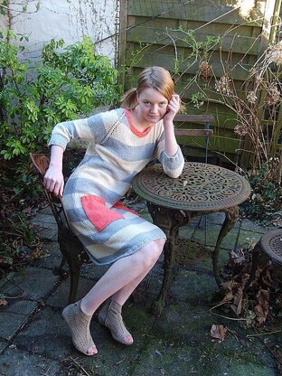 This airy spring dress is perfect for transitioning into summer. The easy top-down construction, with the yarnovers for extra coolness is quickly knitted up. The dress skims rather than clings to the body for ease of movement. The striping allows you to finish up some yarn that isn't enough for a cardigan.… The happy red pockets add a last touch of spring freshness and fun to this versatile dress.