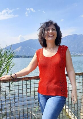 Red poppies is a sleeveless top, worked seamless from the top down. The back is knit from the provisional cast on at the shoulders. The two fronts are knitted in the opposite direction from the provisional cast on too. At the underarms the garment is joined in the round and the top is continued to the desired length. A lace section, on the left side only, makes this project original.