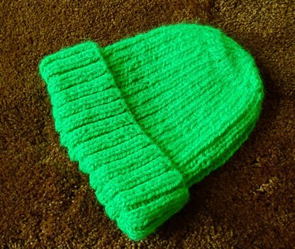 This hat is made with Red Heart Reflective Yarn. If you’ve seen reflective safety clothing that glows in headlights at night, then you’ll have an idea of what this yarn does. It gets its reflective quality from a gray filament that’s wrapped in with the yarn, similar to the metallic threads you see in sparkly decorative yarns. The filament isn’t very noticeable in daylight, although there are several neon colors like the one shown, which are quite visible. But its sparkle will come out in the right light.