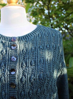 Regn is a short/slightly cropped cardigan worked from the bottom edge and up with a nice structured/lace pattern at the front of the body. The cardigan has long set in sleeves (the yoke is worket in one piece / raglan construction).
