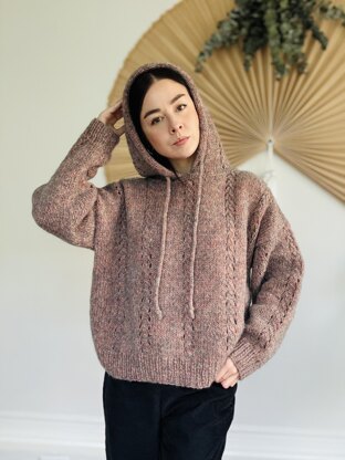 This oversized pullover is worked flat in pieces from the bottom up. Shoulders are joined using Three-Needle Bind-Off, and the hood is picked up and knitted from the neck edge. A few initial rounds are worked at the neck edge in double knitting for added stability. Pieces are sewn together using mattress stitch. A draw-cord