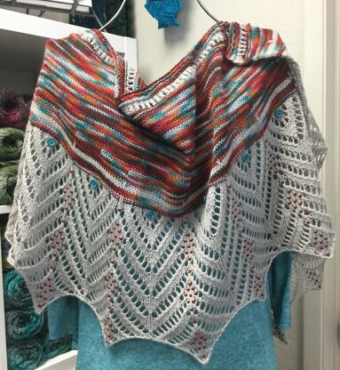 This shawl is gorgeous! It's one of my favorites. There are lovely, deep lace chevrons encrusted with 6/0 Miyuki beads and topped off with turquoise buttons for added drama.