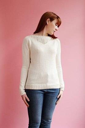 This seamless top-down design has a slightly wider body than many sweater styles so it’s comfortable to wear, while the fitted sleeves ensure it also looks smart. It features an inverted triangle double eyelet motif – make sure to work this motif slightly tighter than the stocking stitch tension so that the sweater looks perfectly tailored.
