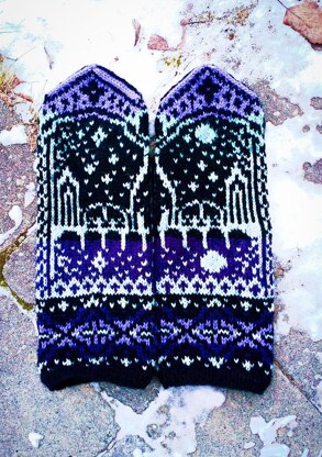 Rendezvous at Midnight is a stranded colorwork mitten design with the afterthought thumb construction. The design has extra charts for the cuffs and thumbs, so scroll down the pattern to see them all before you start.