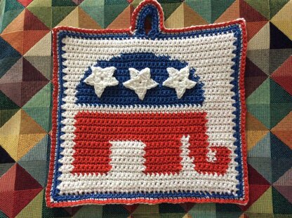 This is an original pattern for a colourful crocheted double thickness potholder with the instantly recognizable Republicans' logo of an elephant on the front. The reverse is plain red, and both thicknesses are joined by a double row of crochet in blue and white with attractive braid effect in red.