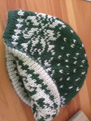The snowflake pattern used in this hat is my variation of the beautiful “Snowflake Border and Flea Pattern” from p. 110 of The Encyclopedia of Knitting. (Philadelphia: Quarto, 2000). I am also indebted to Elli Stubenrauch’s “Bird On a Wire Hat”, published on p. 116 of Vogue Knitting Magazine’s, Fall 2009 edition for introducing me to the double-knitting technique.