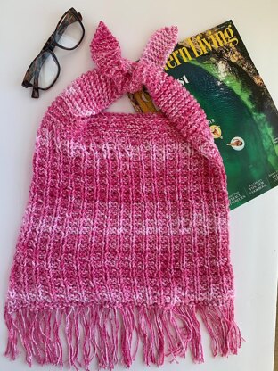 A fun, easy bag that can be reversible, and so cute on either side! One side reveals a nostalgic look with bottom fringe, change it inside out to other side and you have an up-to-date style that will take you everywhere. What a great item to add to your shopping trips. You will want to make several in different colors, and even one for your best friend! These work up quickly, so you can whip up colors for every Season! When you add fringe to bottom one side, it becomes a reversible bag! Make some for gift giving your friends will love this! Great style for “today’s look”! Uses Cotton worsted weight yarn, 24-inch circular knitting needle US# 9.