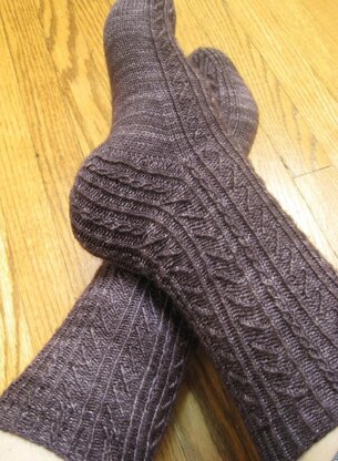 This pattern brings together twisted stitches and cabled twists in a skillful but subtle fashion, offering challenge in the execution but simplicity in visual appearance. Appropriate for a wide variety of light fingering weight yarns in solid or semi-solid tones, this pattern is a versatile addition to your sock drawer.
