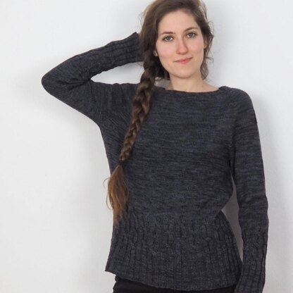 Rhea is a seamless sweater with circular yoke, worked in rounds from top down. For neckline shaping the pattern uses german short rows technique. The round yoke is shaped with slanted increases.