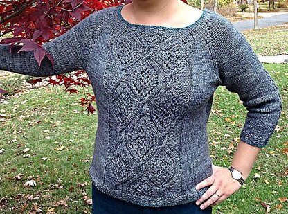 A lovely cable and lace pattern graces the front of a slightly fitted, wide-necked raglan pullover, worked top-down in the round for a seamless project. Offset cables offer detailing on the back of the ¾-length sleeves, and crossed ribbing adds elegance to the hems. For a fun accent, work the hem edges in a contrast color.