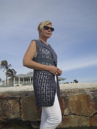 Crocheted in Berroco NaturLin in three shades of blue, this light and airy vest shows the detail of the stitches over a casual white tank and capris. While the stitches look complex, the structure is simple and is surprisingly easy and pleasurable to crochet. The vest is worked from the bottom up and can be shortened or lengthened as desired. Single jewel tones of ruby, emerald, amethyst or black onyx would also be stunning!