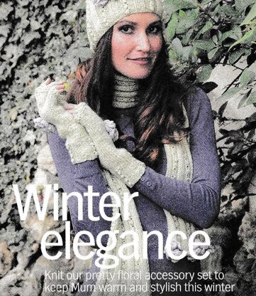 This is a pattern for an accessories set originally published in Knit Today. There is a scarf, hat and fingerless gloves. All are in a bobble rib stitch (the gloves are in stocking stitch with bobble rib cuffs) and have flowers attached. Photos Knit Today. The yarn quantities are for the whole set. Scarf: 3 x balls main, hat and gloves: 2 x balls main, 1 x ball contrast for each (small amount used).