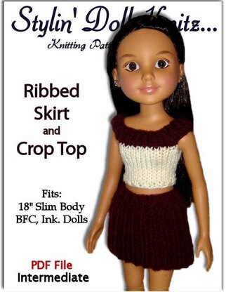 Ribbed Skirt and Crop Top Knitting Pattern, fits 18 inch Slim Dolls, BFC, Ink. dolls. Looks great in school colors. (Best Friends Club)