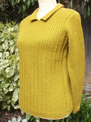 A flattering sweater with graduating rib on the back and front, and sleeves in stocking stitch with narrow ribbed cuffs. The sweet collar and distinctive button fastening at the back gives it a slightly vintage air. The collar is worked in one with the narrow neckband - so if you prefered this design without the collar, simply work the 1st to 3rd rows as given in the pattern for "neckband and collar", and then repeat the 2nd row again and cast off - easy!