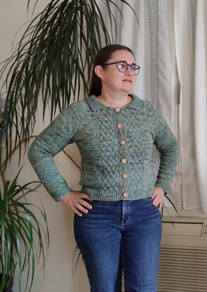 It is worked from top down, with raglan sleeves. A criss-cross motif pattern decorates the fronts and back. The motif is explained by a chart, but quickly becomes intuitive. The rest of the body and the sleeves are worked in stockinette stitch. A pretty folded collar adds a feminine touch.