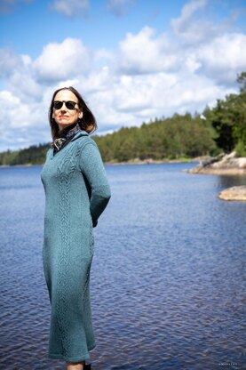 Rikona, Japanese for fruit child, is a seamless A-line dress with a double knitted polo neck collar with a cable pattern running along each side up to the shoulder. The body is worked bottom up in the round up to the armholes, while the sleeves are worked top down. Rikona is knitted in the lightweight, chainette yarn Cashmere 16 Fine from Lana Grossa.