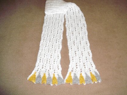 This is a pattern for a lace scarf adorned with a two-color bell edging, and seamed with the invisible join technique.
