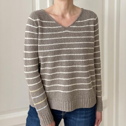 Ringa Pullover is a casual V-neck pullover with narrow stripes, worked in Stockinette Stitch with ribbed hem and cuffs. The pullover is worked top down in one piece, first in rows, then, after finishing the V-neck, completely in the round. The neckline is edged with an I-Cord.