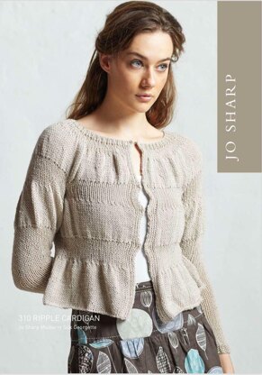 The Ripple Cardigan is worked on large (6.00mm) needles and is quick to knit and very lightweight, with only four or five balls of yarn. The garment is knitted from the bottom up and worked onto a yoke at the top. The model pictured is size A (size 8) and wears a size A garment.