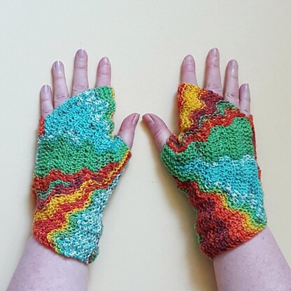 These fingerless gloves are knitted flat and in garter stitch with a wave pattern. One edge of the flat row is the thumb around which the mitt shaped in short rows. It starts with a provisional cast on and ends with a row of grafting in garter stitch. Afterwards the side seams are sewn up.