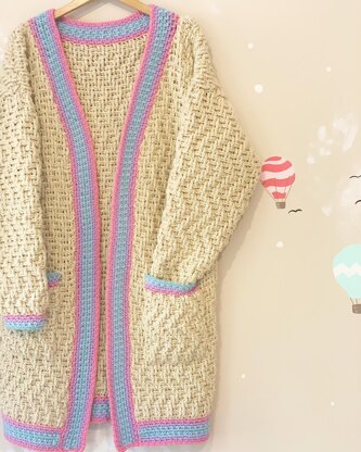 Made in Aran yarn, the Ripple Rib Cardi is a super cozy, super squishy cardi; perfect for snuggling up in the winter or summer evenings by the bbq.
