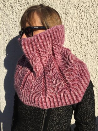 RISPEN is a female cowl worked in two-color brioche stitch, featuring a botanically-inspired allover pattern of frozen trees and leafs. Details like the German twisted cast on, seamless transitions from ribbing and brioche pattern yield a cozy female accessory. Perfect pattern to gift yourself or to warm the ones you love.