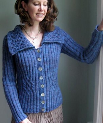 This top-down, raglan-style cardigan is worked in an allover rib stitch in one piece. At four points around the waist (two at the front, two at the back) the ribs curve into a cable motif, providing gentle, flattering shaping. A rectangular shawl collar is worked separately in an all-over version of the same motif and sewn on.