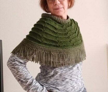 An easy cropped cape with a delicate fringe. Any medium, worsted weight yarn, wool or acrylic, can be used. The simplicity of the design makes it easy to complement many outfits in a wardrobe. Worked in the round. Pattern includes 2 sizes, a schematic, and photos. Size: S/M and L/XL. Skill Level: Easy. Knitting Needles: US 8 and US 10