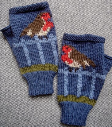 “Robin on a fence” fingerless gloves/mitts - in 4ply weight wool with a robin sitting on a fence on the front of each glove. The fence continues round to the back of the gloves.