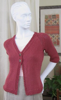 This little cardigan is classic enough to go from day to evening and easy enough to work up quickly. Seed stitch trims the edges, waist shaping and raglan armhole shaping create a refined fit. Two decorative buttons add a feminine touch to front edge. Work the body in one piece to the beginning of the armholes. The sleeves are worked in the round to the 3/4-length. From there, the pieces are joined to work the yoke back and forth in one piece. The only seams are at the underarms, so finishing is quick and easy. The soy yarn has a great hand that reminds one of cotton or a cotton/linen blend.