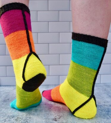 I'm thrilled to design again for the Lots of Socks KAL, which recognizes the beauty and uniqueness of individuals with Down Syndrome. For these socks, I chose some bright mini-skeins and arranged them in bold colorblocks. A main color stripe (an I-cord incorporated right into the socks) travels down the back of the leg, then splits around a Fleegle-style heel (great for high insteps!). Donations from the sales of these socks will go to benefit Down Syndrome International to give children with Down Syndrome around the world a rock-solid foundation.