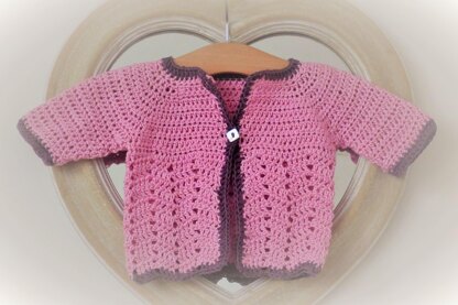 Roesia is a delightful crocheted cardigan with a straightforward raglan yoke, 3/4 length sleeves and a lovely peephole chevron lace stitch for the main part of the body.