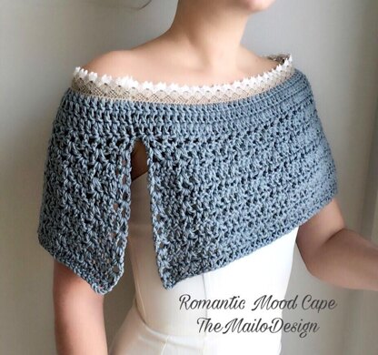 • Crochet hook (6mm, US – J/10, UK – 4; 4 mm, US – G/6, UK – 8) • Lace with small holes along the edge aprox 100-120 cm / 39 – 47 inch depends on your shoulder measurement • Recommended yarn: Paintbox Yarns Cotton DK in 1 ball 127 m / 137 yds; weight DK/8 ply, This cape made working 2 strands together • For size S-M you will need 450 – 500 m / 492 – 550 yds, depends on length you want