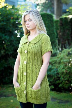 The cardigan is worked as a top down raglan and is completely seamless. Several textures are combined in this design to give the cardigan its feminine, elegant, and romantic look.
