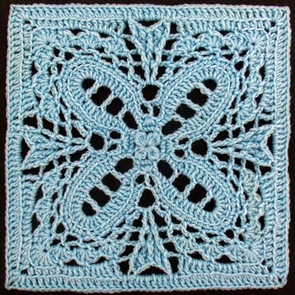 This pattern uses an unusual floral motif, lace, shells and post stitches to create a unique 12 inch square.