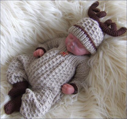Outfit consists of an all in one back button fastening romper suit, bootees, brimmed hat and optional reindeer antlers.