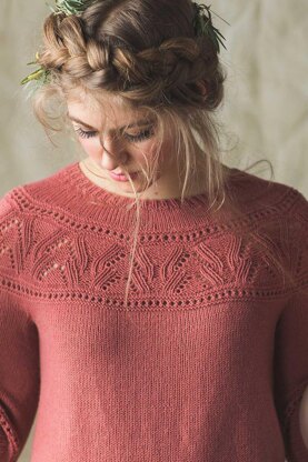 The Rose Bush Pullover starts with a tubular cast-on and is worked seamlessly from the top down. Savor knitting the circular yoke, short-rows, and lace-and-eyelet pattern in this ultrasmooth, lightweight yarn that blends merino wool and baby camel.